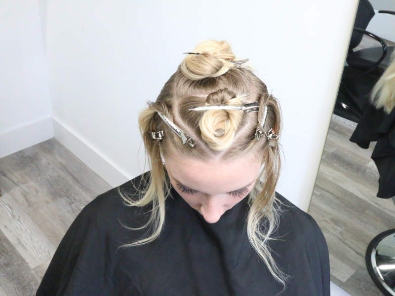 Si votre cliente aime remonter ses cheveux : tenez compte de l’entretien au niveau de la ligne de pousse; Olivia utilise une combinaison de profondeur et de clarté, crêpant les cheveux pour une repousse naturelle.