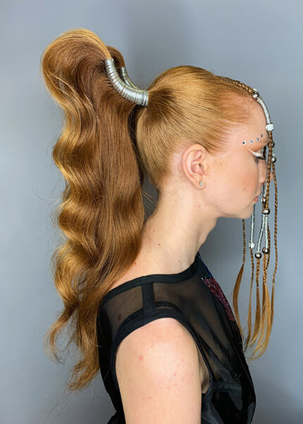 « J’ai créé 2 tresses infinité sur le dessus, rassemblé le reste des cheveux dans une queue de cheval haute et ajouté des rallonges de 30 pouces pour créer un effet dramatique. Les barres en métal ont ensuite été placées pour donner un peu plus d’audace au look. »
