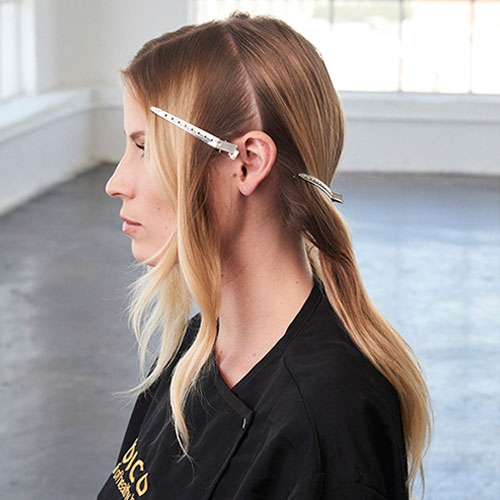 Passez ensuite à l’avant et prélevez de fines séparations diagonales vers l’avant et appliquez la formule 1 sur les mèches qui encadrent le visage; on les appelle des « skin lights ».