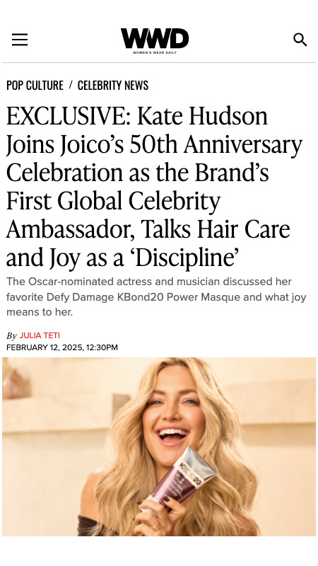 The best way to kick off our big 50th anniversary this year? By sharing the truly joi-ful news that actress / singer / entrepreneur, Kate Hudson, has joined our brand as Global Celebrity Spokesperson. We tapped this Hollywood darling – and her infectious sense of joi – to join us for this ultimate season of celebration because, frankly, we can’t think of a celeb who more perfectly exemplifies Joico’s positivity and passion for healthy hair.